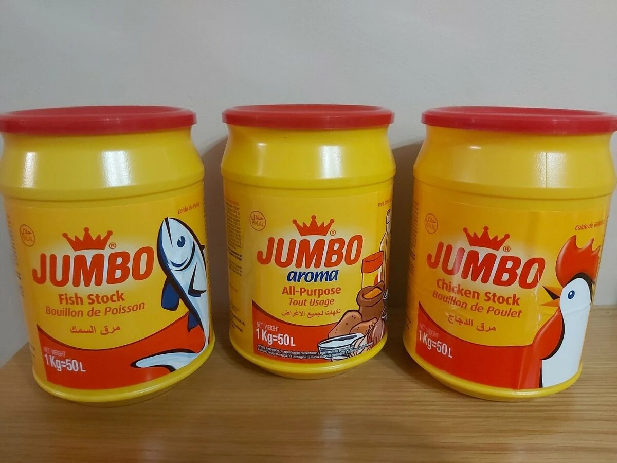 Jumbo Poulet et Poisson Arôme sont deux produits de la marque Jumbo, probablement des bouillons ou des assaisonnements, destinés à rehausser le goût des plats. Jumbo est une marque connue pour ses produits culinaires, notamment en Afrique, et propose une gamme de bouillons en cubes et en poudre, dont les saveurs poulet et poisson.