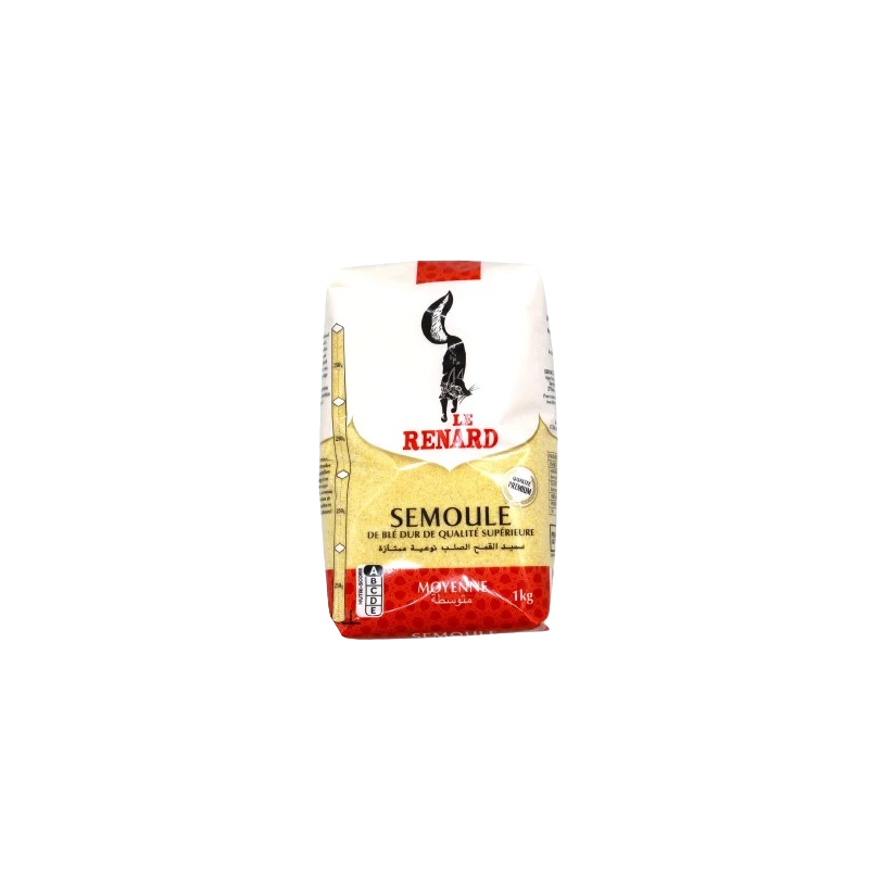 Produit : Semoule de blé dure moyenne.Marque : Le Renard.Origine : France.Poids Net : 1kg Ingrédients : 100% Semoule de blé dur de qualité supérieure.