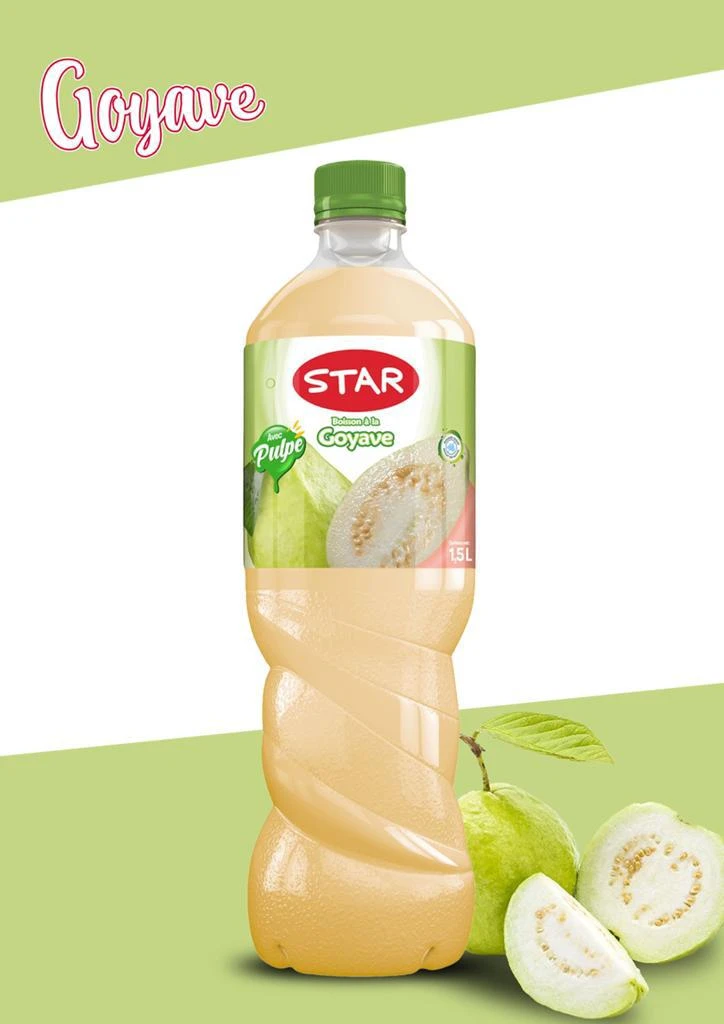Star Goyave is a guava-flavored soda, typically sold in 1.5-liter bottles. The product is part of the Star brand and is categorized under sodas, lemonades, and tonics, specifically within the cola, soda, ice tea, and syrup category. It is available in packages of 6 bottles. The EAN code for this product is 150BOT0281